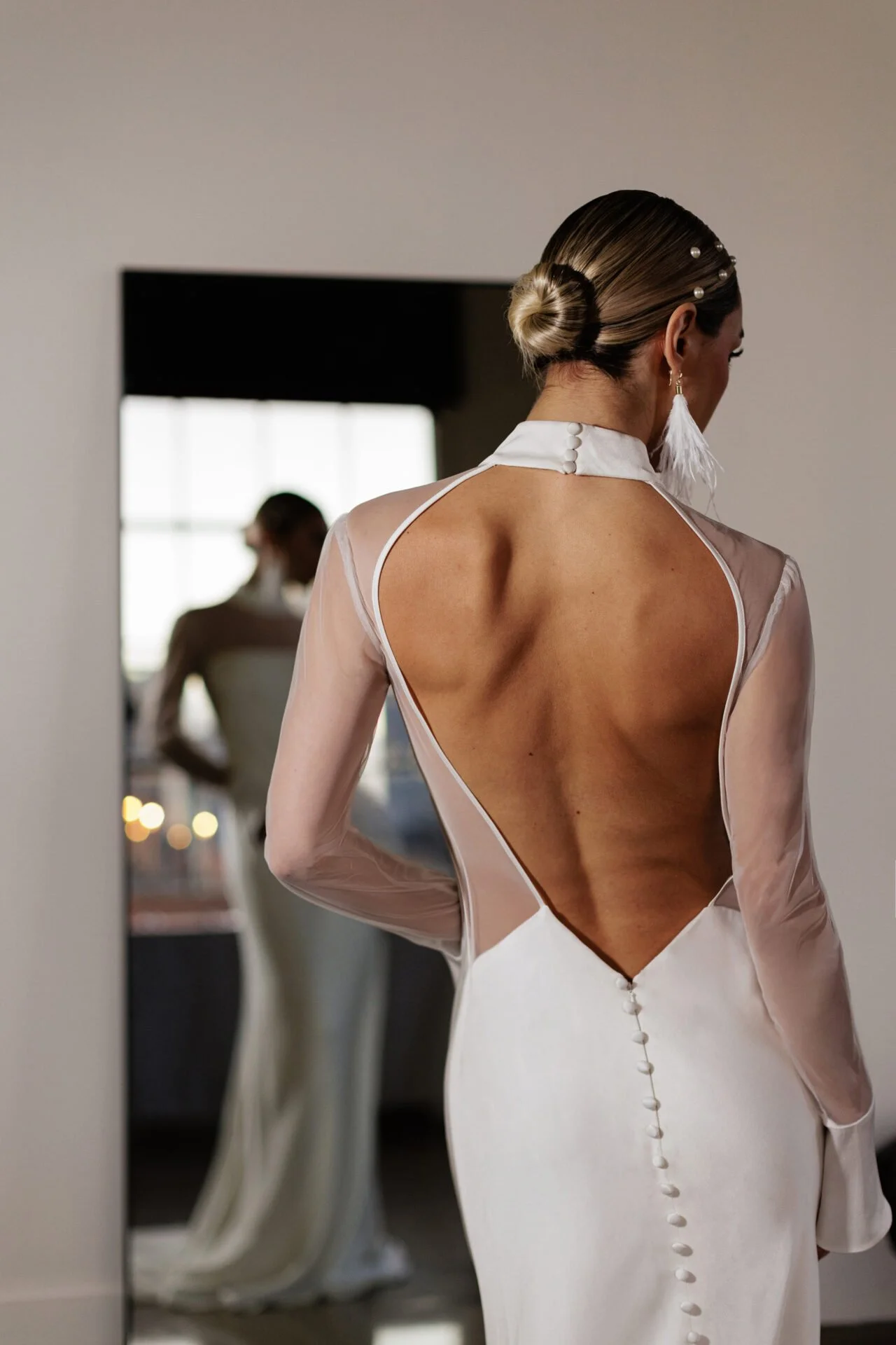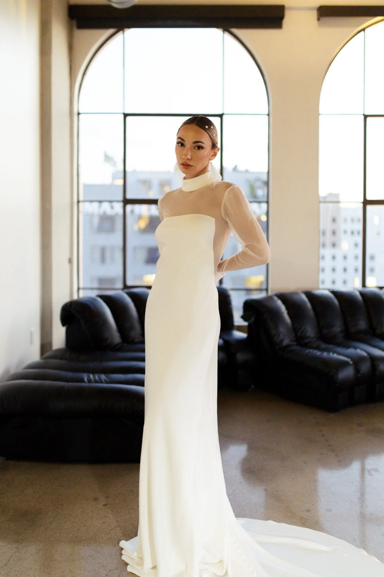 Mock Neck Satin Crepe Sheath Gown with Open Back