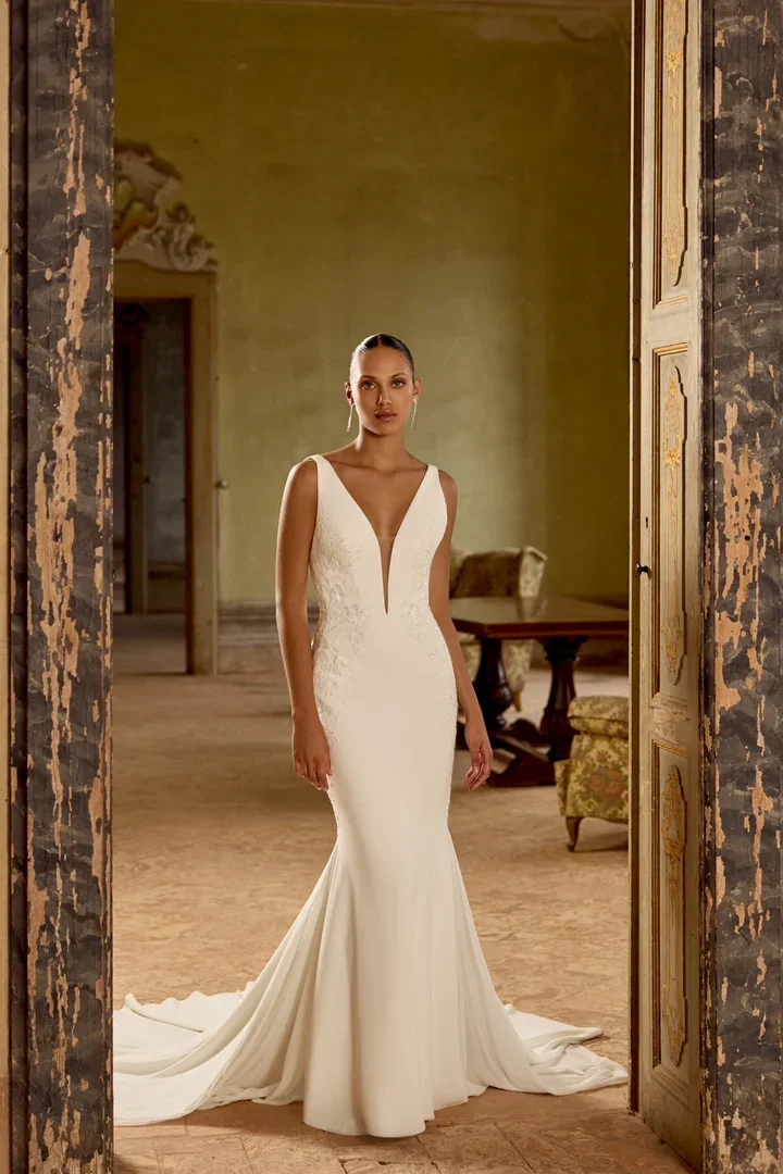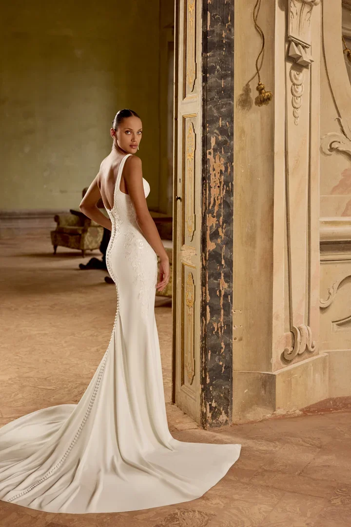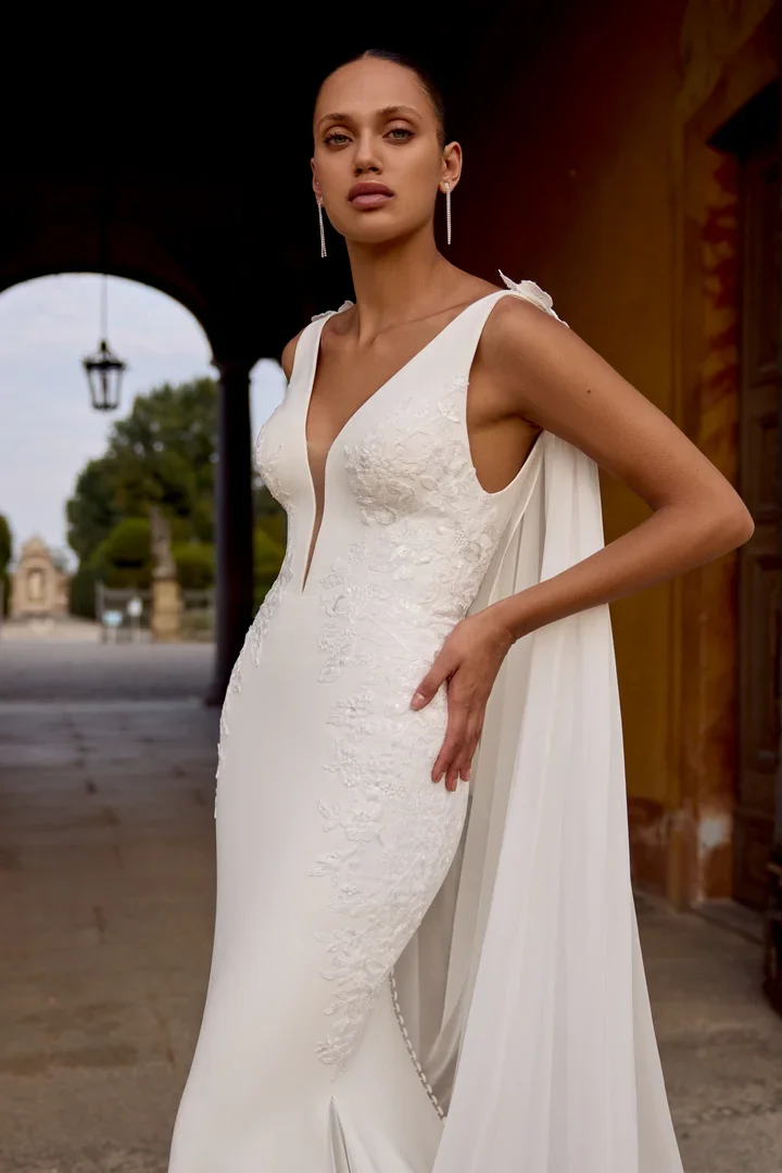 V-neck Plunge crepe and lace trumpet with low back and buttons