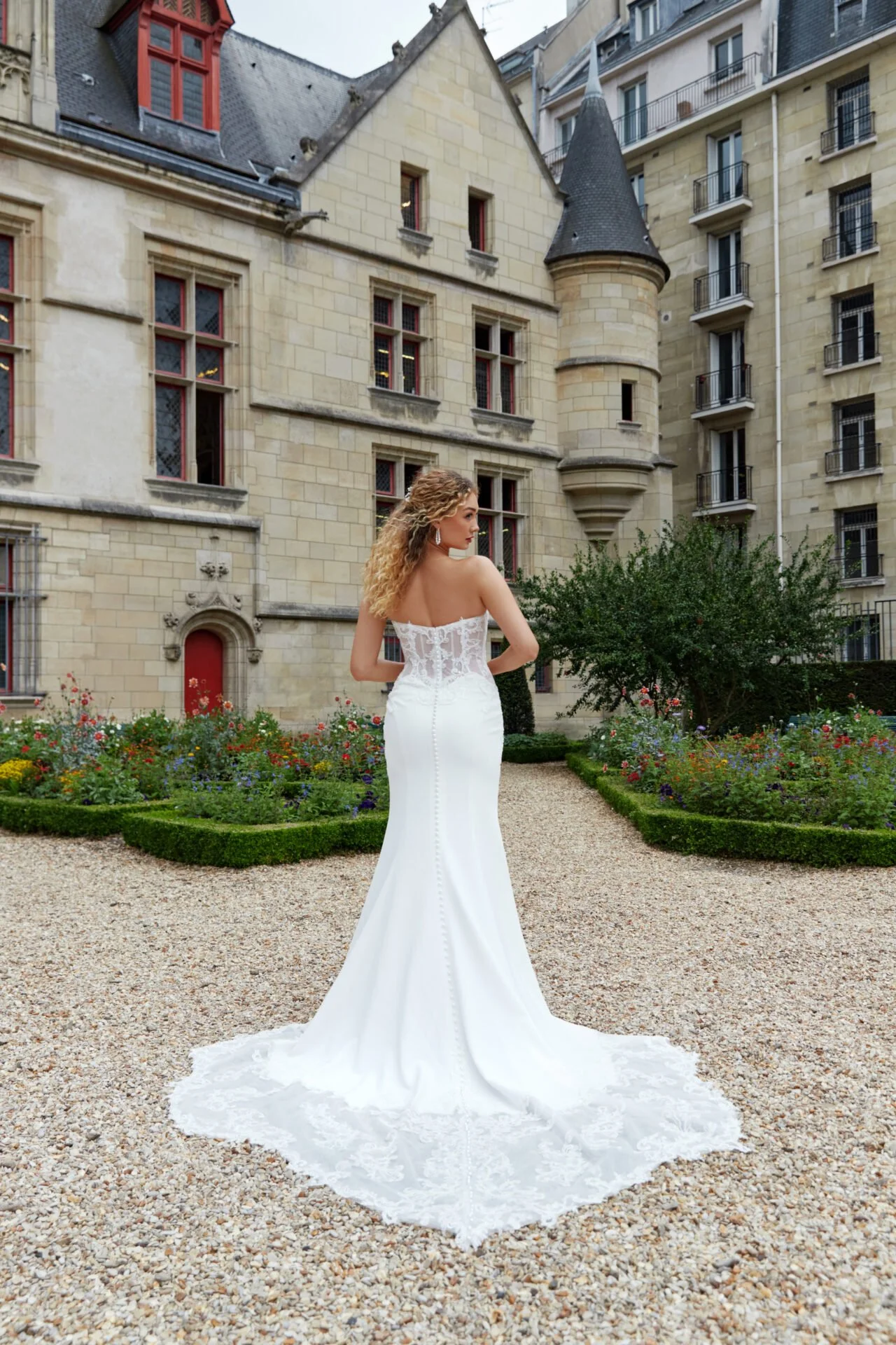 Strapless Plunge Neck Lace and Beaded Crepe Sheath