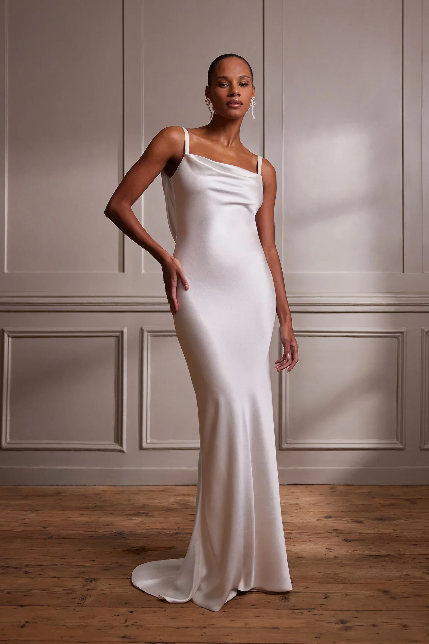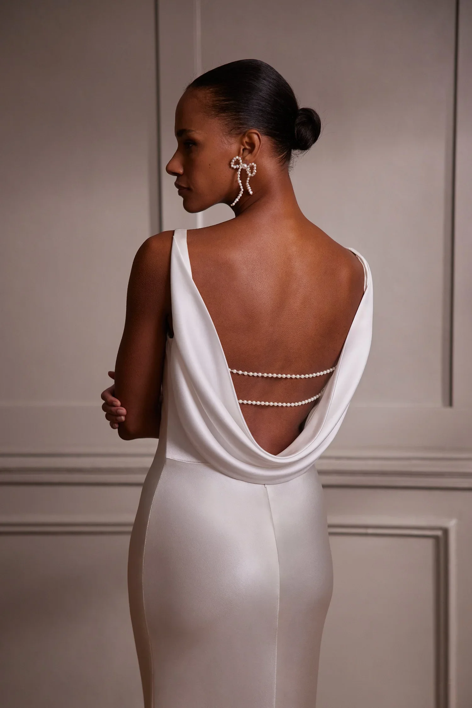 Cowl Neck Silk Sheath Gown with Low Cowl Back and Pearl Detailing