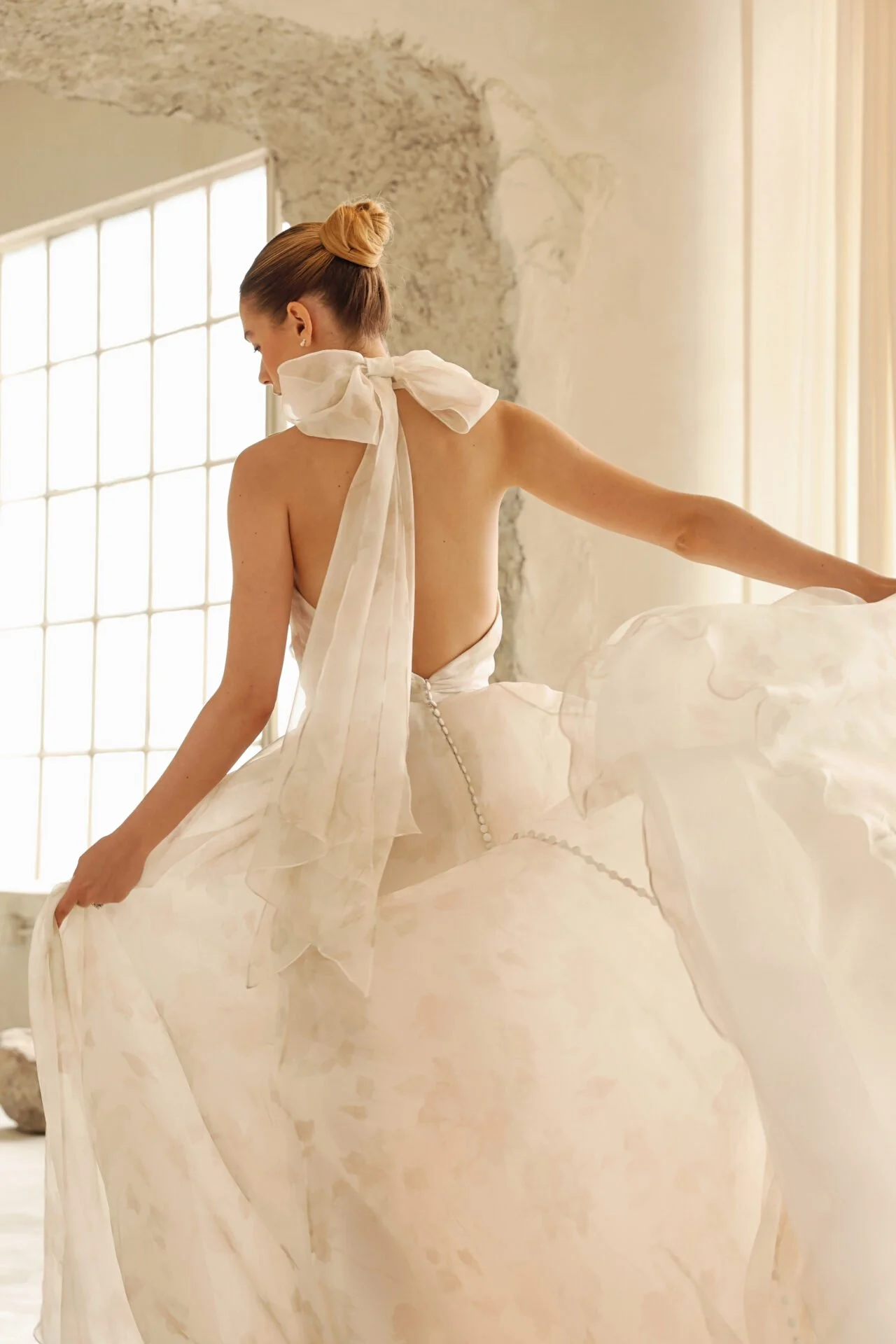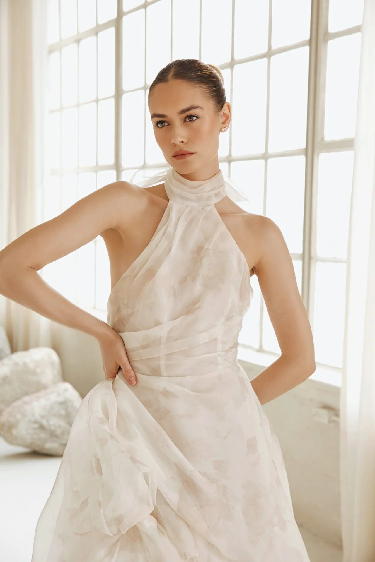 Halter top silk organza ballgown with pick ups and slit