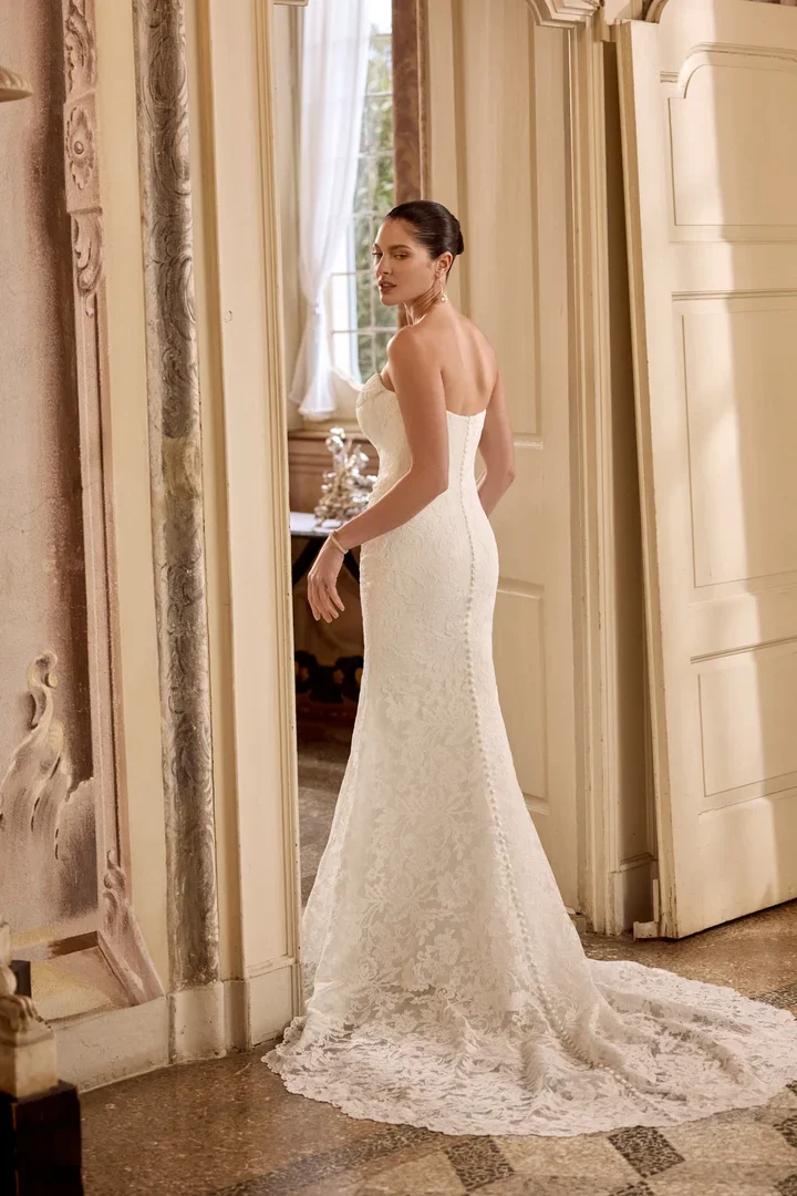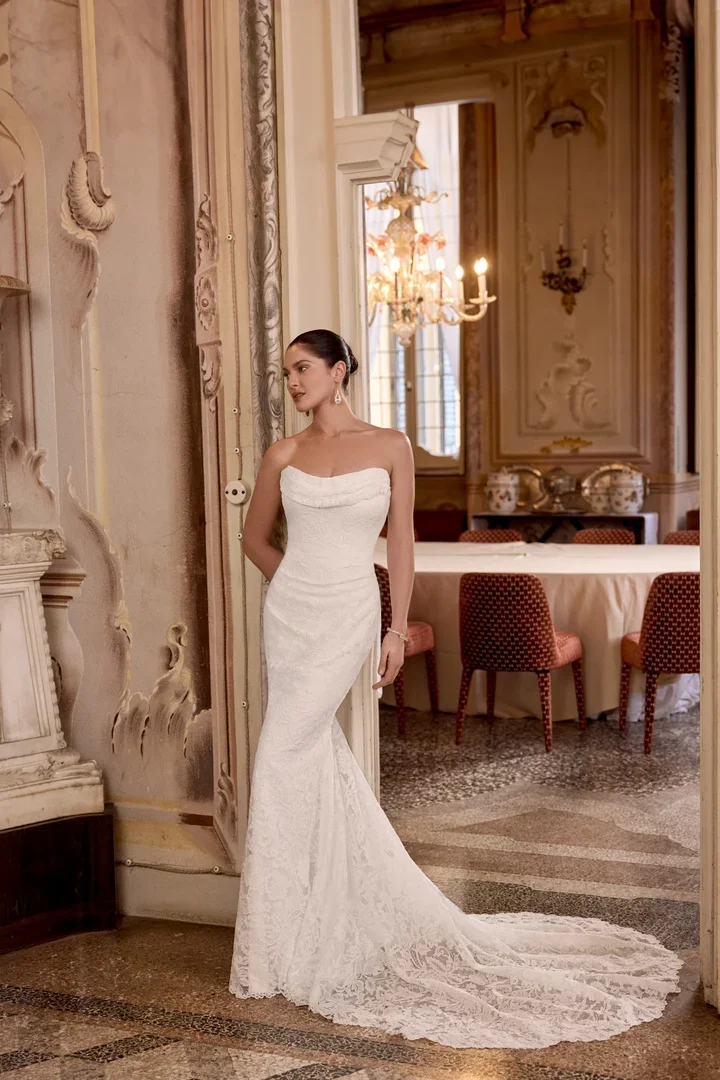 Allover Corded Alençon Lace Fit and Flare Gown with Draping