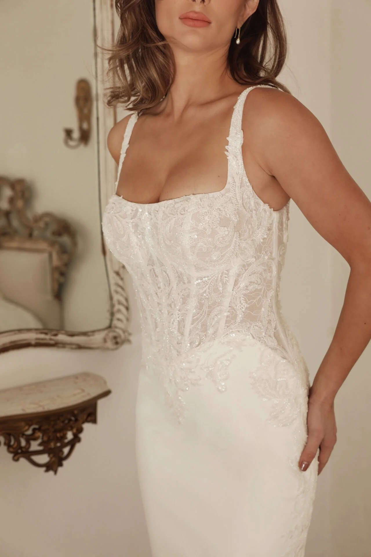 Square Neck Crepe Sheath with Lace and beading Long Train