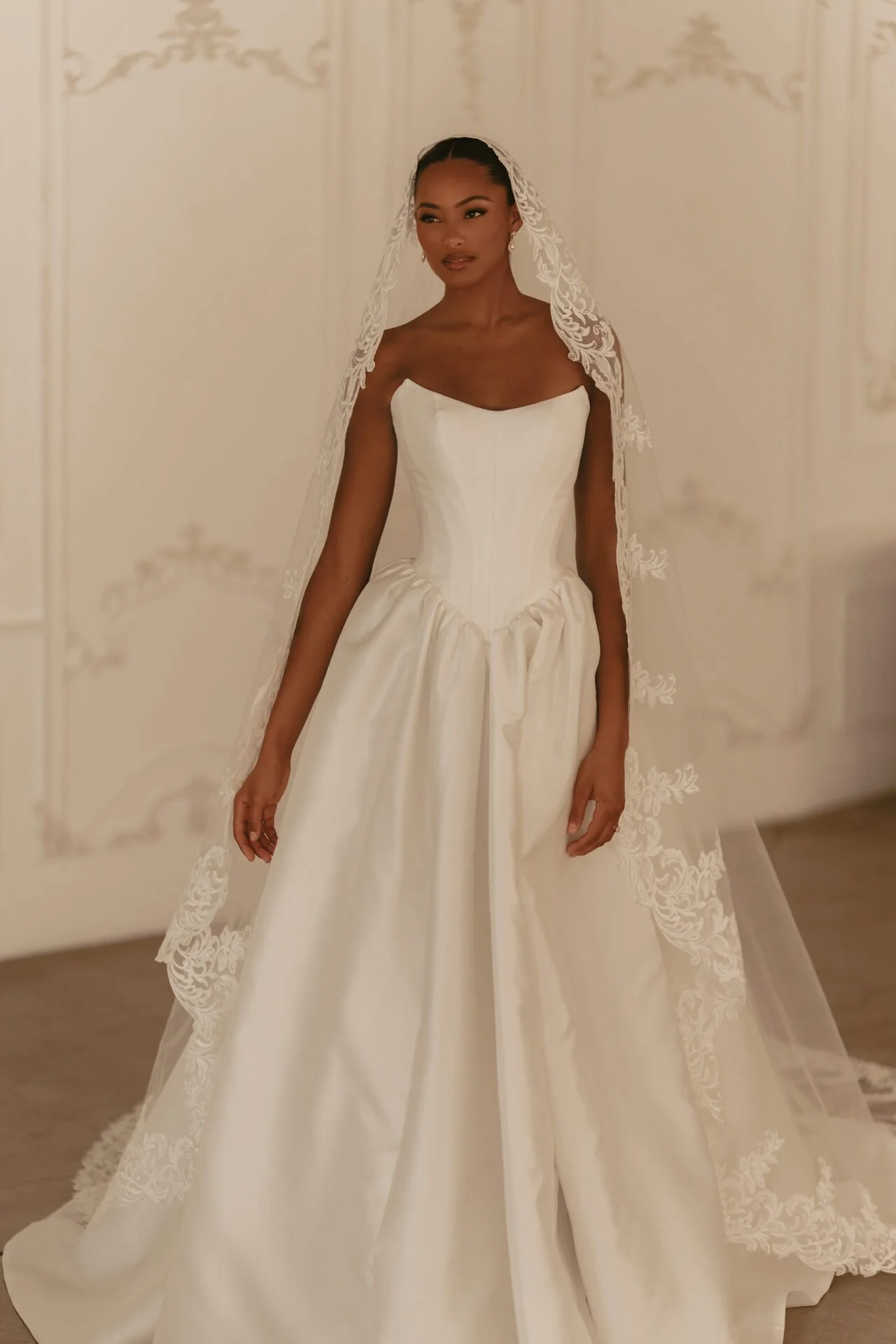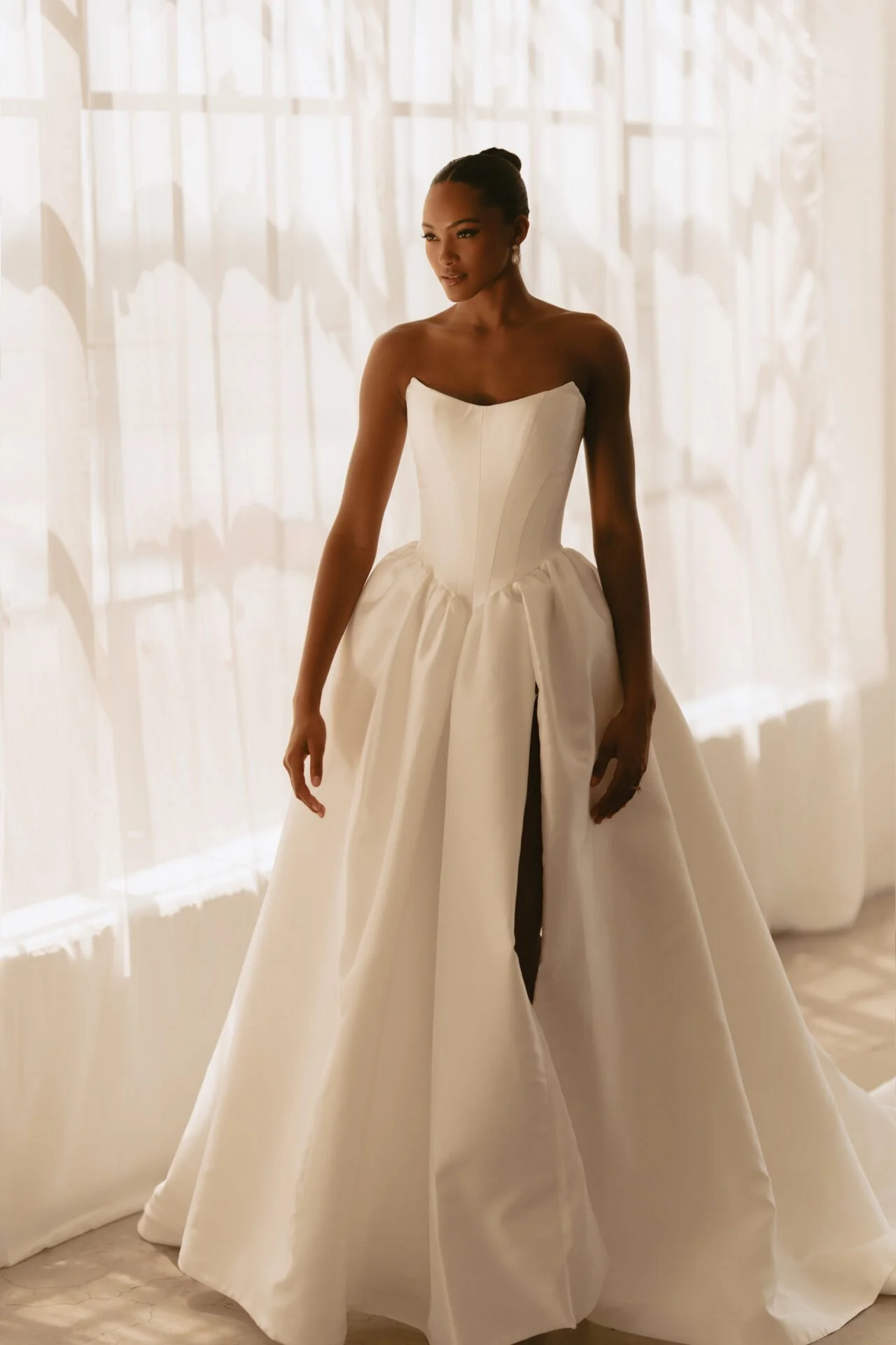 Strapless Cat Eye Neck Basque Waist Ballgown With Slit.