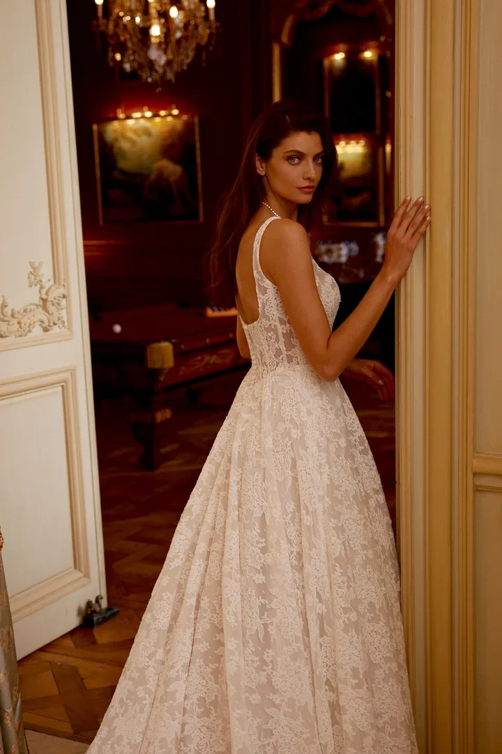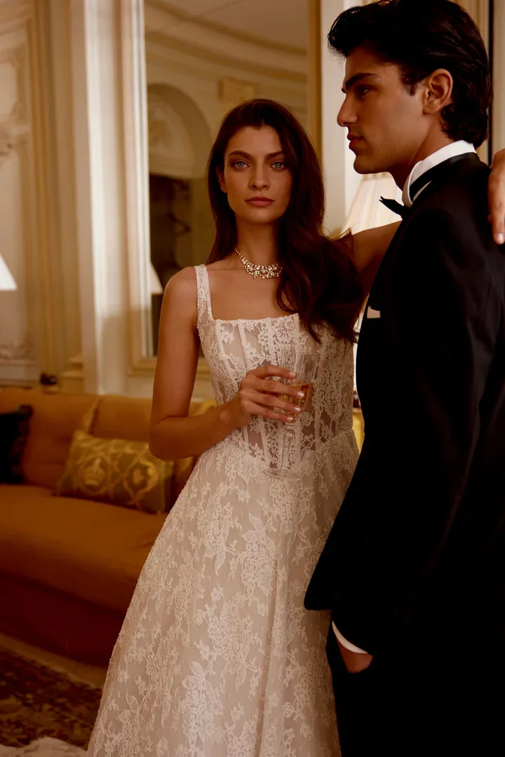 Square neck basque waist lace ballgown